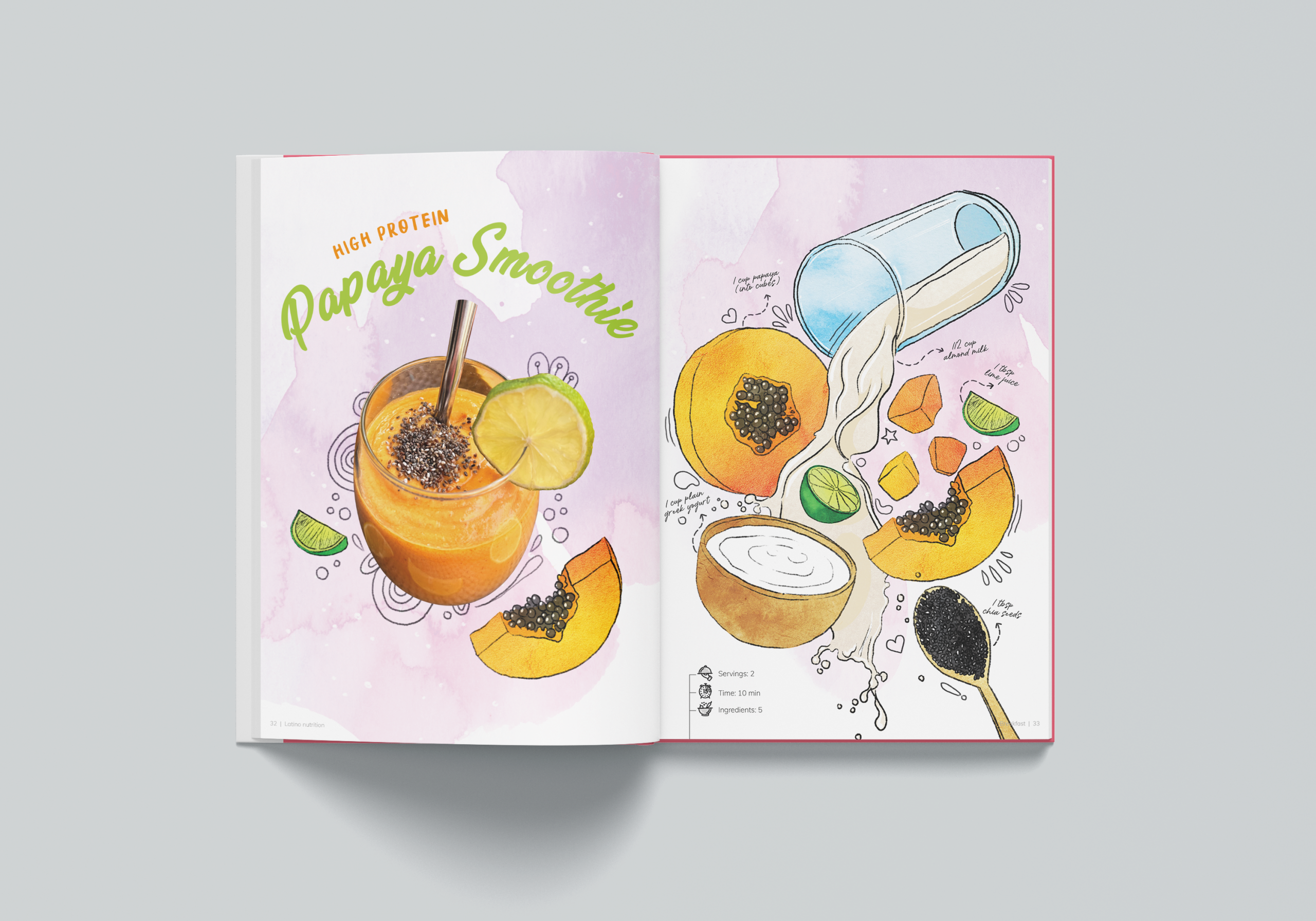 We refined the collection of recipes, photos, and nutritional data into a unified visual and editorial system inspired in the latino culture. We took inspiration in the idiosyncratic of latino typical celebration dresses, typical neighborhoods and commerces, and, of course, latino food. Layouts, typography, and color palettes were chosen to feel modern and professional while still reflecting Latino culture.